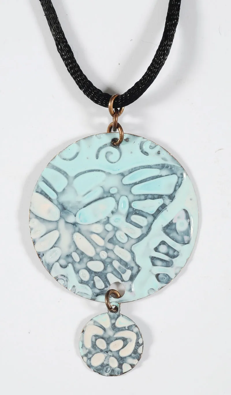 Use the Crop-A-Dile to punch a 1/8” hole in the bottom of the pendant (opposite the existing hole). Open a jump ring with pliers, place the satin cord in the jump ring, and close the ring. Add another jump ring to the existing ring. Open a third jump ring, add it to the second, and add the large round pendant before closing.