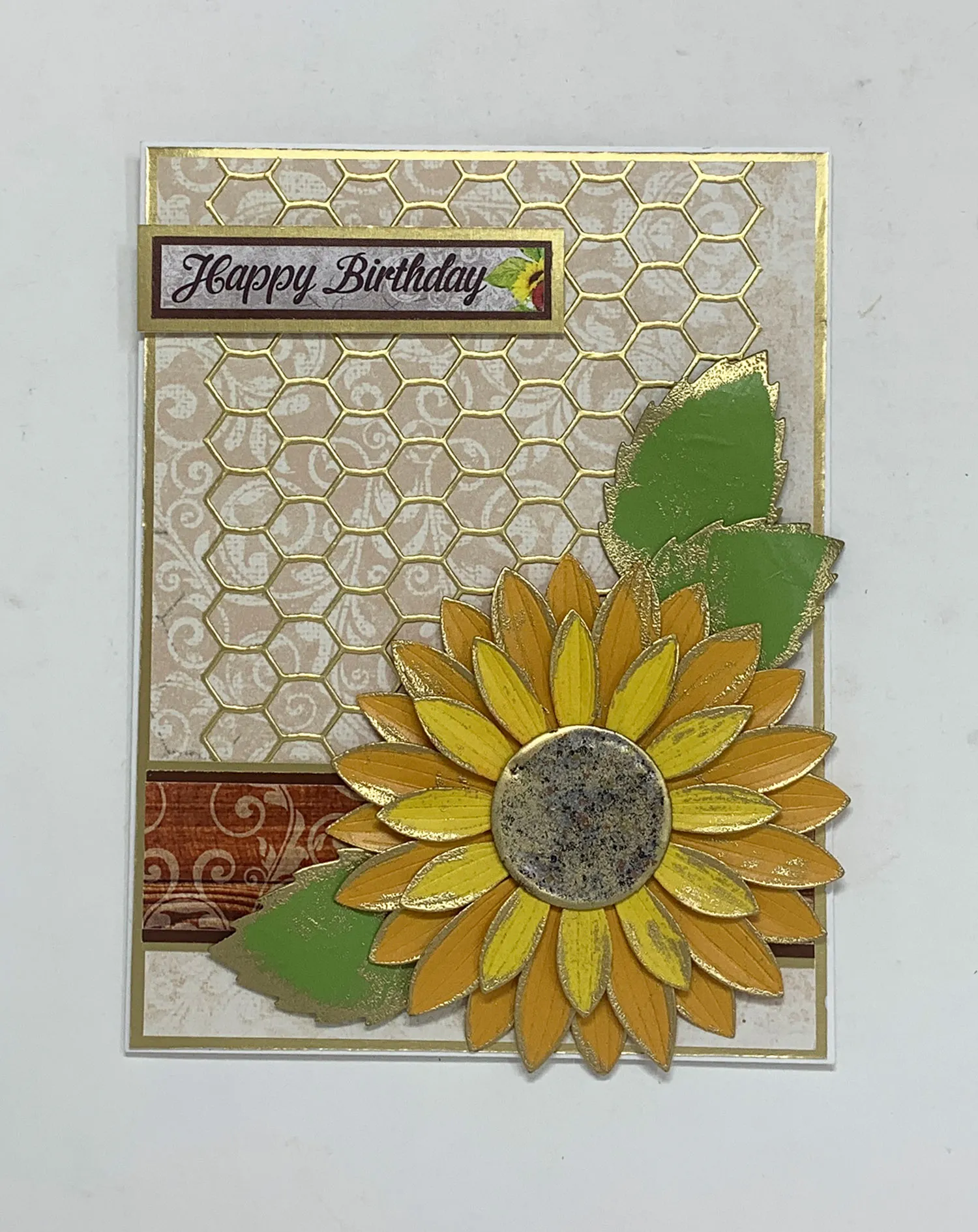 Punch out the Sunflowers “happy birthday” die-cut and mat it first on brown cardstock with 1/16" borders, then on Gold cardstock with 1/8" borders. Foam tape it as shown.