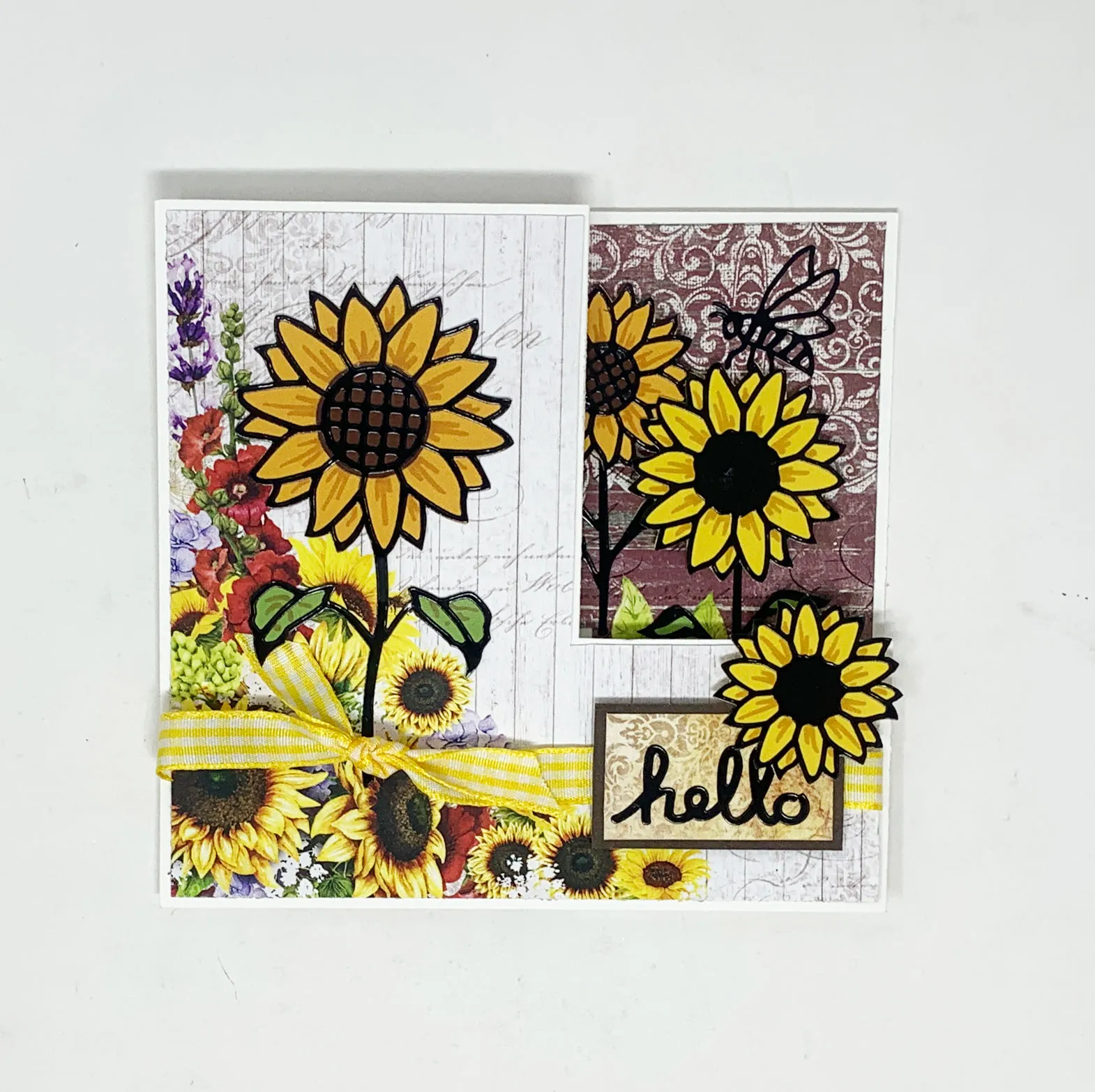 For the front: Trace and cut the front paper pattern from Sunflowers white boards cardstock with the flowers in the lower left corner. Wrap yellow gingham ribbon across the cardstock, ¾" from the bottom, and glue the ends to the back. Tie a 4" ribbon onto the first ribbon, 1½" from the left edge, then glue the cardstock centered on the front panel.