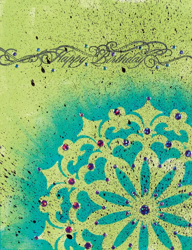 Place the card on a protected surface and mist with Majestic (purple) spritz as if radiating from the center of the template and then out to the card edges. Let dry.