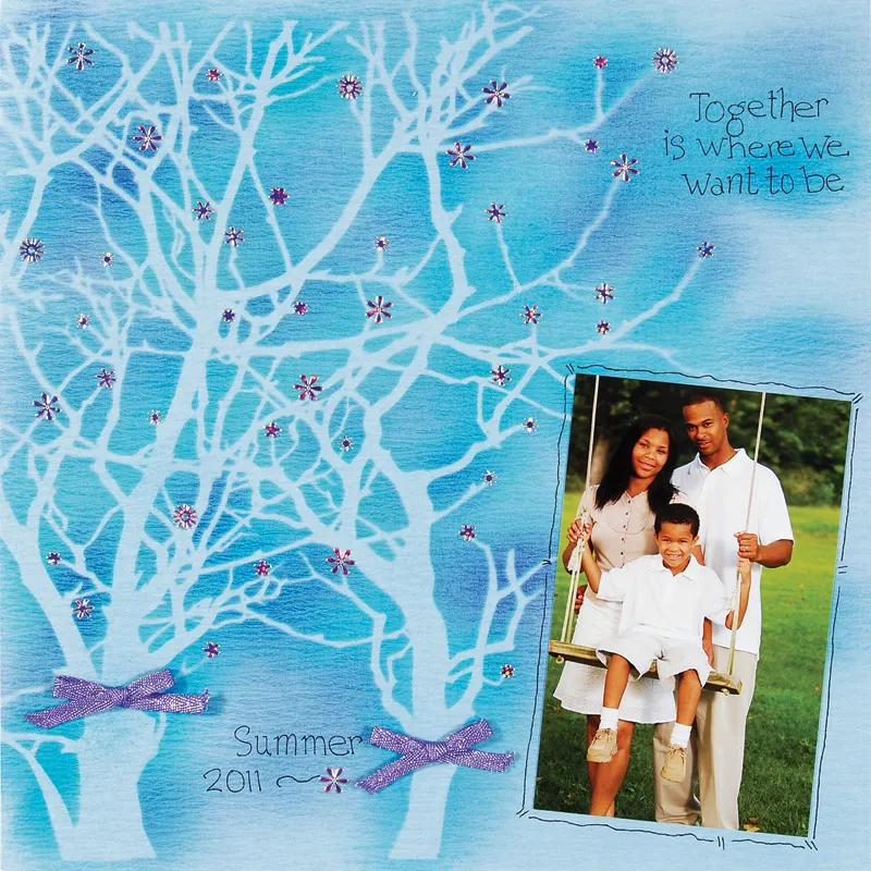 Glue the photo to the bottom right corner and outline with a fine point pen. Add handwritten journaling and bows to the tree trunks. Place Jewel Flower Dazzles™ among the tree branches.