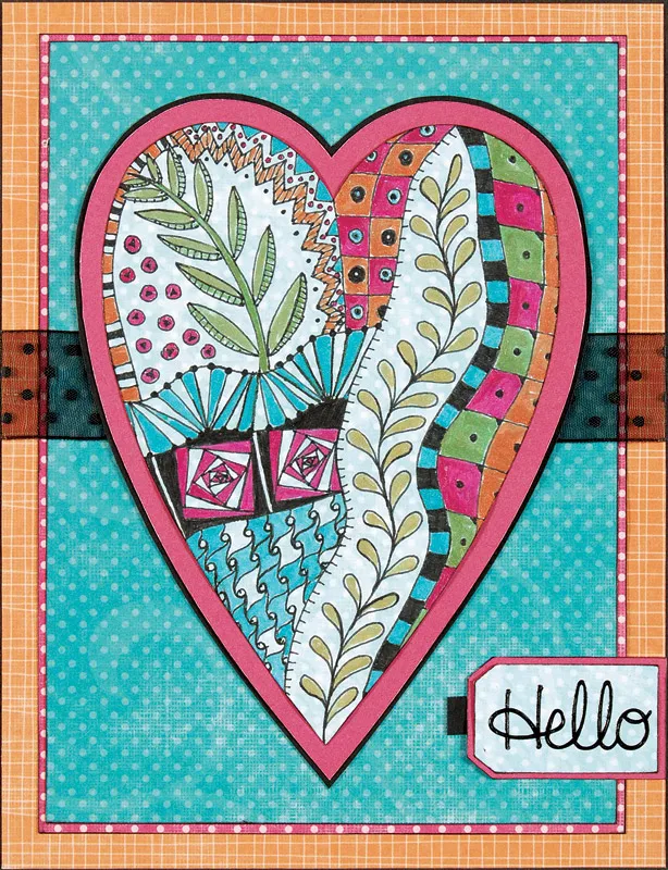 Mat a 3” x 3 ½” teal dotted rectangle on black, leaving a thin border. Write or computer print “Have a wonderful day!” on orange, trim to a rectangle, and glue across the teal rectangle, ¼” from the bottom. Glue the rectangle centered to the inside. Trace an F3 heart shape onto light aqua dotted paper with the black pen and cut it out. Use a pencil to divide the heart into two sections, then draw in the tangles with the black pen. Paint in some of the detail with Smooch inks. Mat on dark pink, leaving a 1/16” border. Ink edges and glue to the teal rectangle as shown. Trace an F4 Folk heart onto orange textured paper and an F5 Folk heart onto pink/white dotted paper. Ink edges of each and layer over the Zentangle heart as shown.