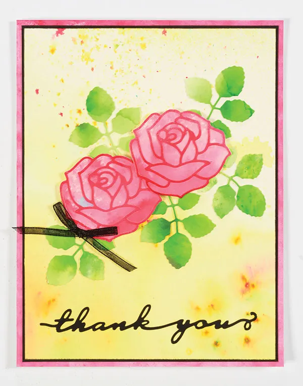 Layer 2 roses together and foam tape near the center of the card as shown. Glue 5 leaf sprigs near the roses. Place Dazzles™ “thank you” across the bottom of the card as shown. Use 1/8” black organdy ribbon to tie a bow. Zot™ the bow on the card as shown.