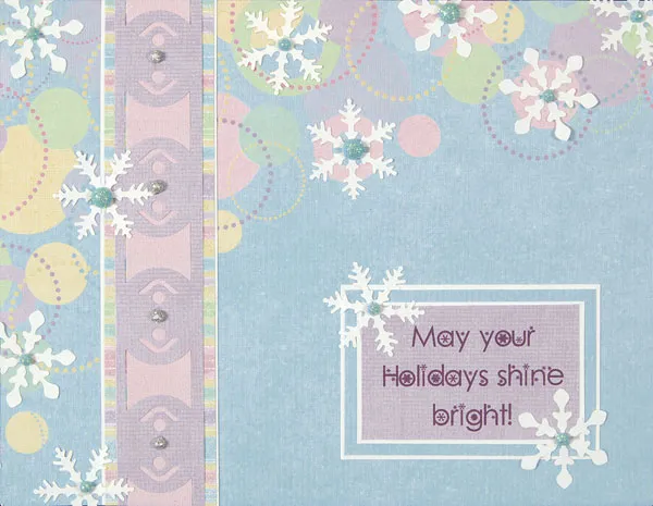 For the inside: Cut a 5” x 3 3/4” piece of the remaining blue border paper. Glue it centered on the inside back. Print the sentiment in purple on white and cut it out, leaving enough white area around it to punch a snowflake at the upper left and lower right. After punching, mat the sentiment on purple, then glue it to the blue piece, off-centered.