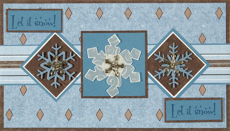 Cut two 1 1/4” brown squares and mat each on white then on blue. Glue a felt snowflake to each, then add a snowflake brad in the center. Position the three squares across the stripe as shown and glue to secure.
