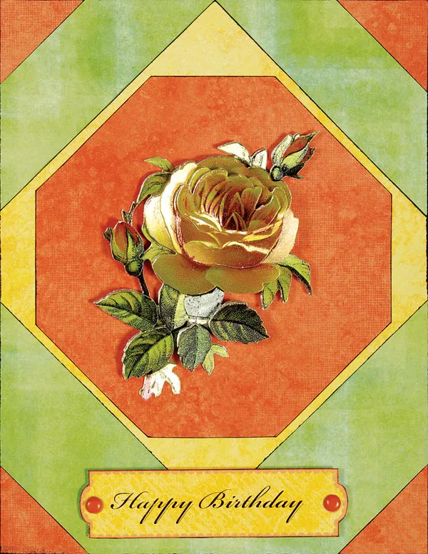 Cut a 4 1/8” square of orange texture paper. Trim ½” off of each corner, creating an octagon and 4 small triangles. Ink the edges of all pieces. Glue the octagon to the center of the yellow diamond and glue the 4 triangles to the 4 corners of the card. Cut out a yellow tag, write or print “Happy Birthday” on it, add 2 orange mini brads, and foam tape to card, centered and ¼” from the bottom.