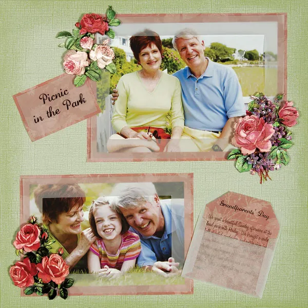 Print “Picnic in the Park” onto a 2 ½”x1 ¾” piece of vellum and use Vellum Glue Dots to mat onto a 2 ¾”x2” piece of pink flowers. Glue to the page ½” from the left and 2 ½” from the top, tilted to the left and overlapping the large photo.