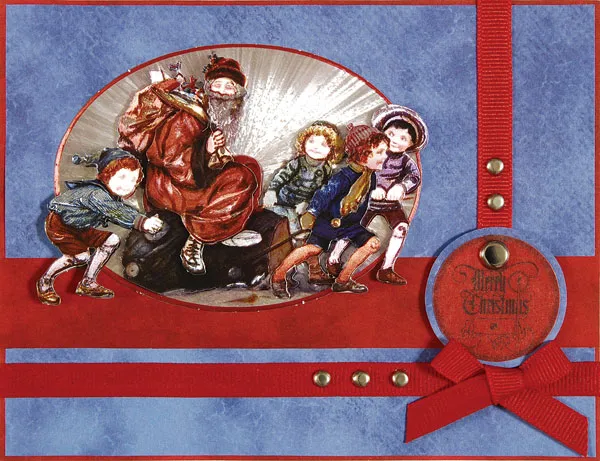 Tie a bow with 8” of red ribbon and glue to the bottom right corner on top of the horizontal ribbon. Cut out a circle tag and glue to blue texture. Trim around, leaving a 1/8” border. Add a silver brad and foam tape to the card directly above the bow. Insert two silver mini brads on the ribbon above the tag, and three on the horizontal ribbon to the left of the bow.