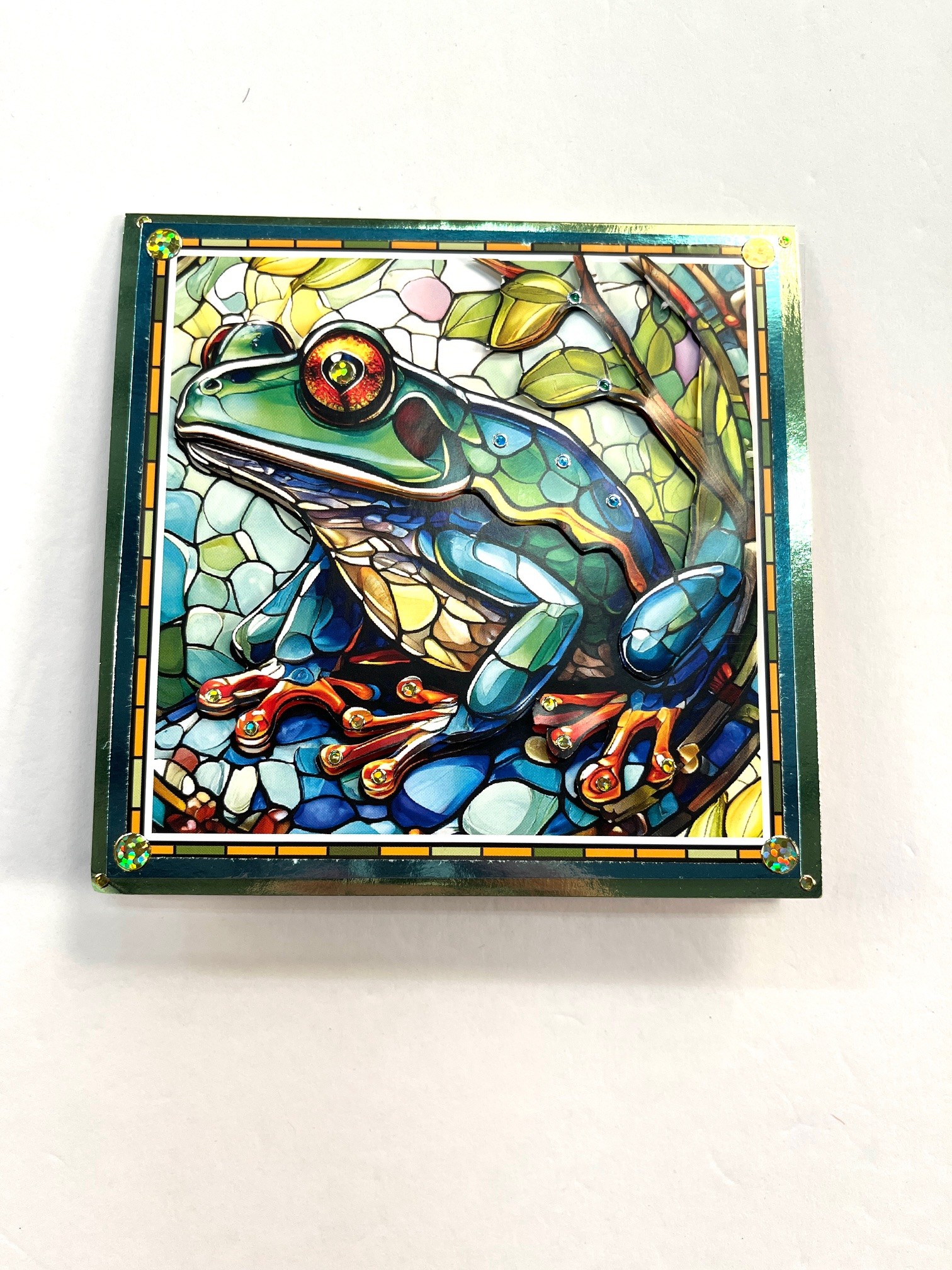 Cut 5”x10” piece of green Mirri. Place on scoreboard and score at 5”, fold on the score line making a 5”x5” card. Place with the fold at the top. Cut a 4 1/2” square of teal Mirri and tape to card front leaving 1/8” green Mirri borders. Trim down the frog Little Book page up to the colored borders and tape to card front leaving 1/8” teal Mirri borders. Trim the frog and branch from another page and foam tape to the first layer. From another frog page trim the top of the frog and foam tape on top. Place jewel Dazzles™️ as shown.