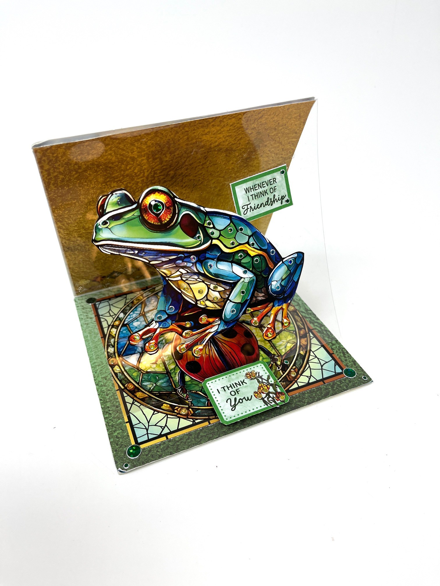 Inside card top: For top area cut a 5”x5 1/2” acetate and score 1/2” at the top leaving 5”x5” with a ½” flap. Go over the score with the bone folder. Place Extra sticky tape on the flap and secure to the card base. Tape a 5” square yellow Stained Glass 6x6 Patterned cardstock covering the acetate fold. Trim out another frog and foam tape to the acetate as shown. Tuck “Whenever I Think of Friendship” cutout from the 6x6 Patterned cardstock behind the frog. Place Dazzles™️ as shown.