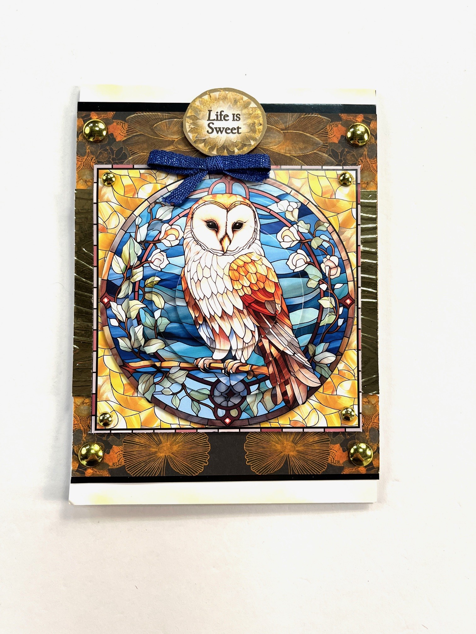 Trim the owl page to 4 1/4” square and foam tape centered 1/2” from each side and 1” from top and bottom. Create four additional layers by cutting circles from other owl pages measuring 4” across, 3 1/4” across, 2 3/4” across, and 1 1/2” across. Foam tape on top of each other matching the art. Make and Zot™️ a 2” bow from the Blue Ribbon Set and place centered over the base owl page. Foam tape “Life is Sweet” cutout from the 6x6 paper collection. Place gold studs as shown.