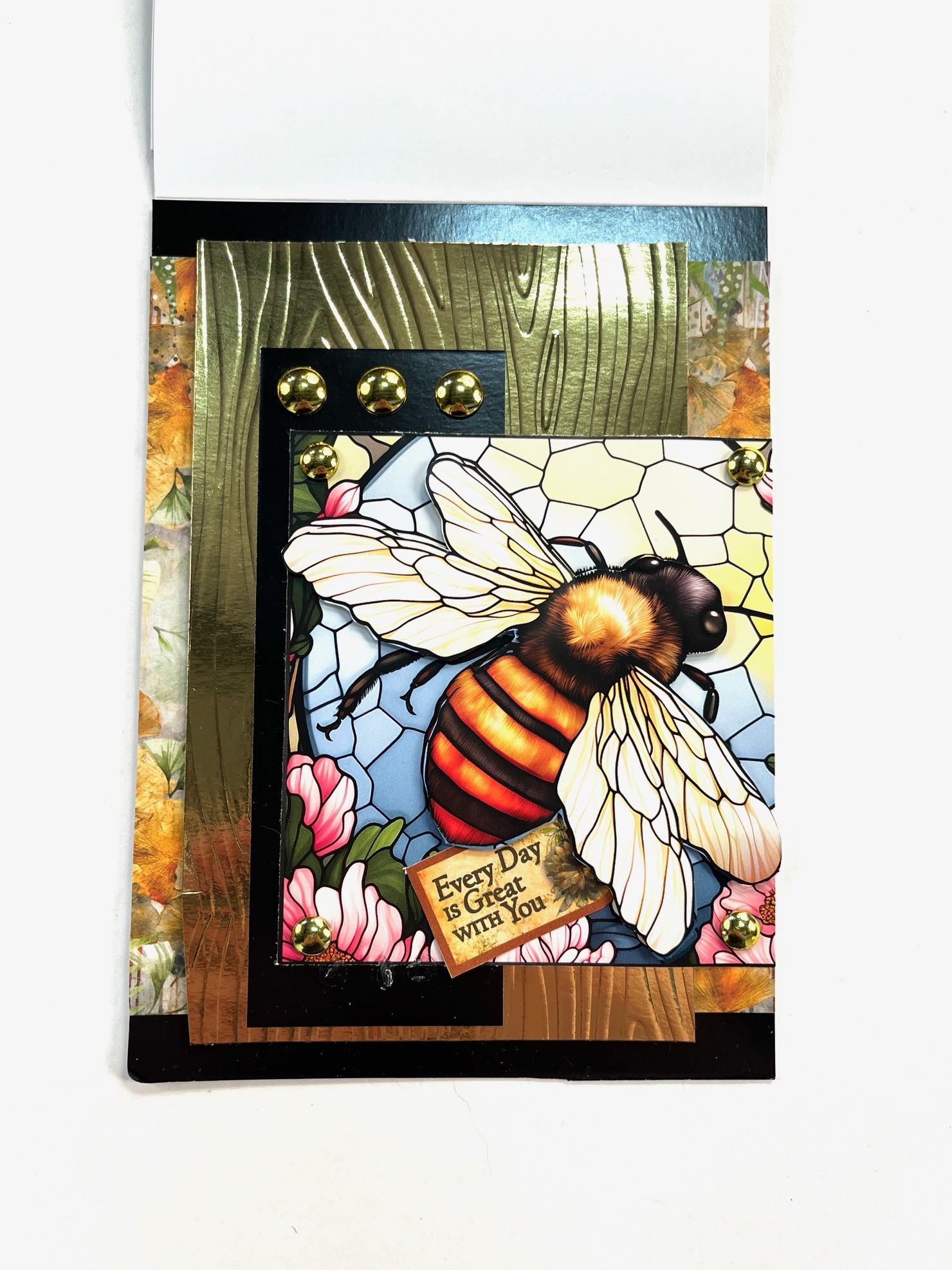 Cut 2”x5 1/4” black Mirri and tape to gold embossed piece. Trim the bee page to 4” square and tape to card flush to right and 2” from the fold. Trim out the “Every Day is Great with You” cutout from the 6”x6” Patterned cardstock and tape under the bee. From another page trim out just the bee and foam tape on top of the matching art. Place gold studs as shown.