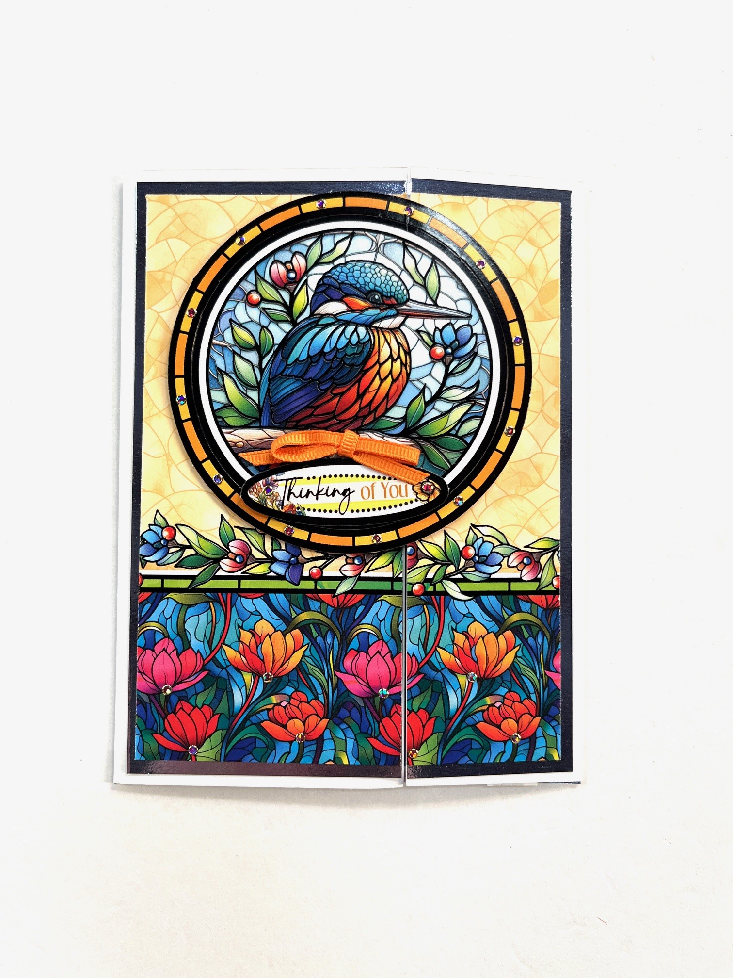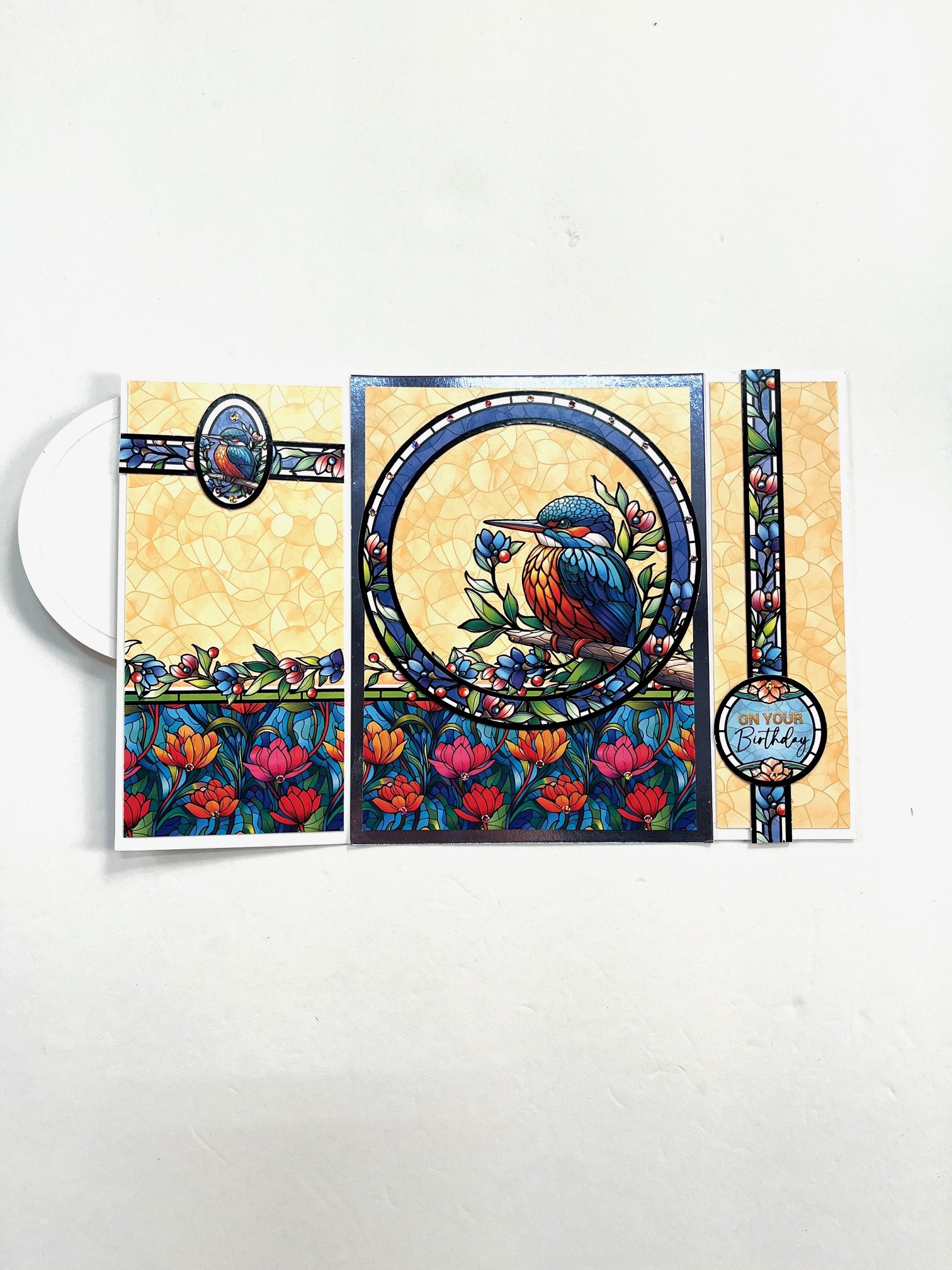 Tape a 4 7/8”x 6 3/8” gold Mirri to the center. Cut 4 1/2”x6” Adorable Scoreable with the border at the bottom and tape to Mirri leaving 1/8” Mirri Borders. Tape the outer Topper Ring circling the Kingfisher 1/4” from the top and 1/8” from both sides.