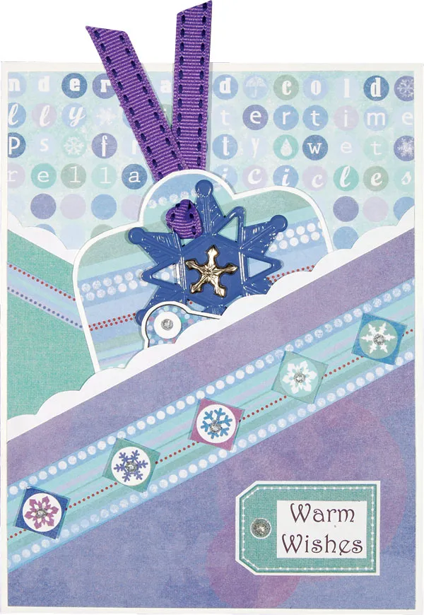 Cut out five small square snowflake art pieces and add foam tape to the back of each. Adhere them across the purple pocket’s border, then add a small glitter dome to each. Cut out the teal tag with a narrow white edge. Print “warm wishes” in black on white, trim it out and glue it to the tag. Glue the tag to the lower right with a 5mm glitter dome on it as shown.
