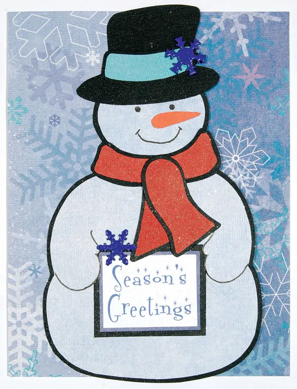 Mat the scarf pieces and the hatband on black. Draw the hands, mouth, and eyes on the snowman. Glue the carrot in place. Print the greeting in blue on white and mat it on the dark blue texture, then on black. Use the knife to cut around the two hands, just enough to slip the greeting under them. Glue the greeting in place. Add a snowflake brad above it as shown.