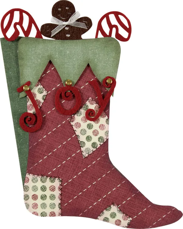 Cut apart the letters in the felt “JOY” and use mini brads to attach them to the points on the cuff as shown. Cut two candy cane felt shapes to 1 3/4” tall. Glue white paper to the back of both candy canes and one gingerbread man. Position the felt shapes behind the cuff to extend above it. Glue them to the back of the cuff. Add foam tape to the back of the cuff points, then adhere and glue the cuff at the top of the stocking.