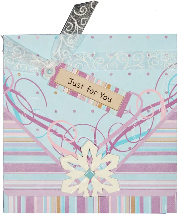 To finish the Pocket: Cover the outside back with purple dots paper. Cut a 12” x 1” strip of the stripes paper. Wrap it around the lower front flap, over the back, and then to the front again, securing the sides and making a short pocket. Mark where the slit should be. Remove the strip and cut the slit with the knife, then glue the strip in place. Insert a gift card and the finished tag into the pocket, close the card, and insert the snowflake in the slit to secure it.