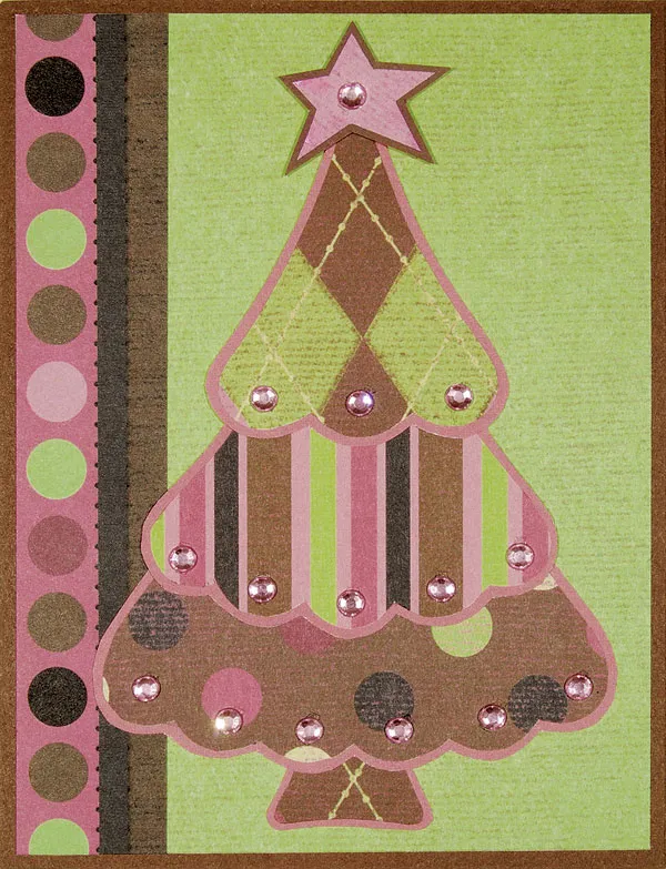 Trace the patterns. Cut the trunk and top section from the argyle. Cut the center section from stripes and the bottom section from dots. Mat all the pieces on pink. Cut the star from pink textured paper and mat it on brown.