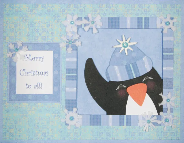 Print the greeting in blue on white, then trim it out. Mat it on dots paper, then on blue, varying the mat widths as shown. Glue it to the card front on the left end and adhere a snowflake at the upper left. Add a 3mm glitter dome to the center of each snowflake. Add a 5mm glitter dome to the center of the hat pompom.