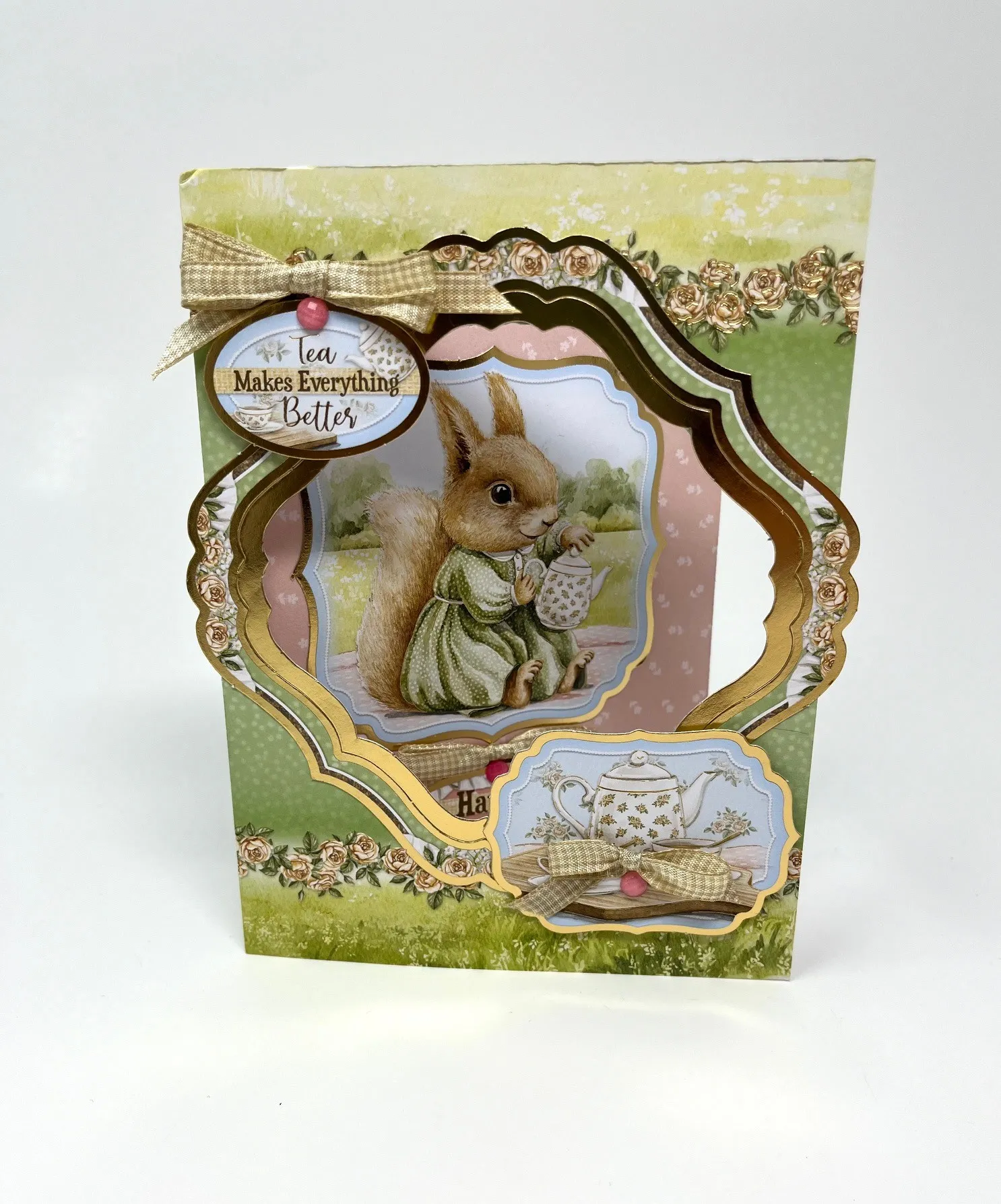 Glue the double frames to the card. Foam tape "Tea Makes Everything Better" Topper to the top left. Make and Zot™️ a 2" wide ivory bow above it. Place pink Diamond Sparkles below as shown. Foam tape the tea pot Topper in the lower right then make and Zot™️ a 1" ivory bow in the center with a pink Diamond Sparkles below it.