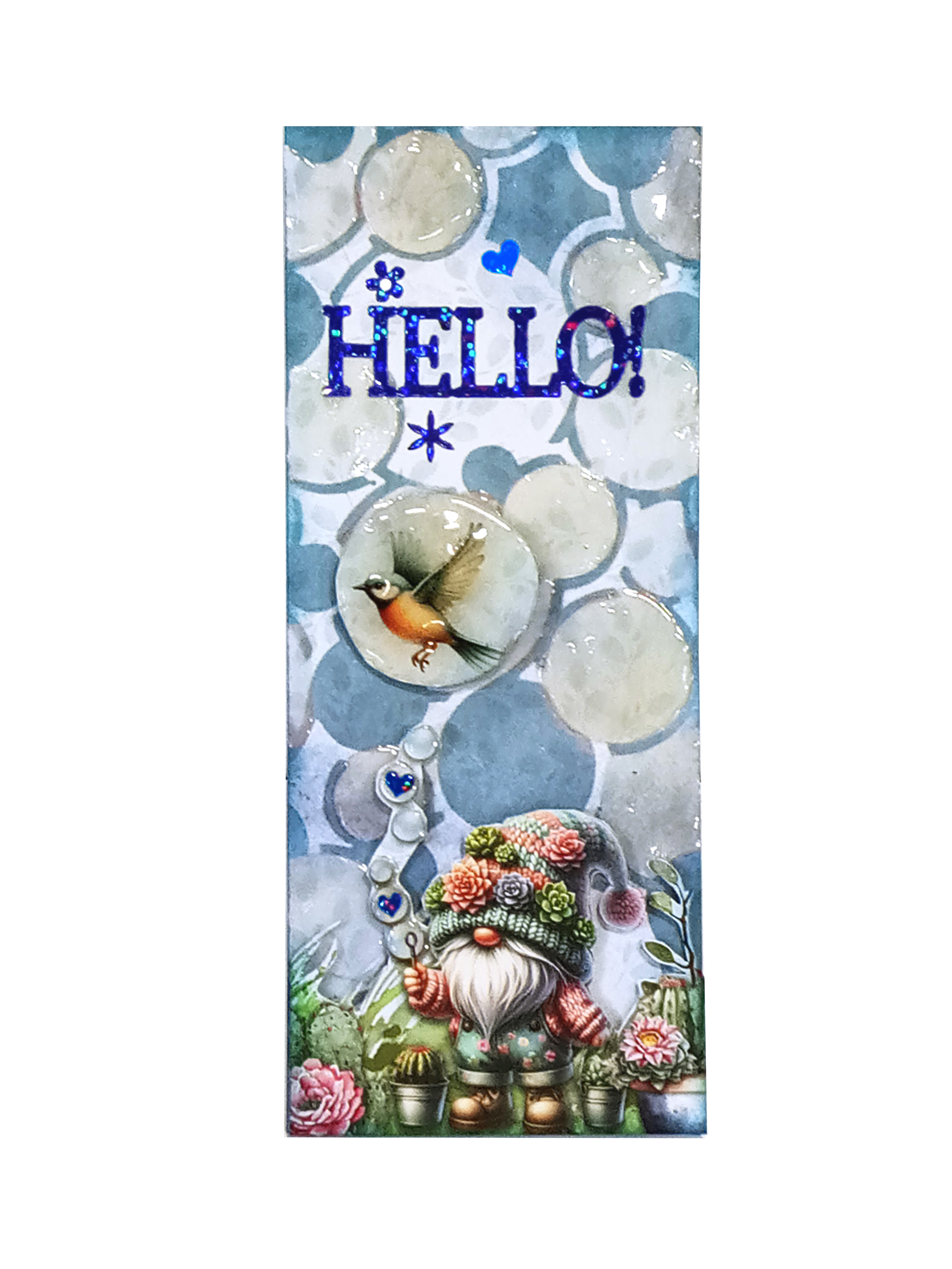 Cut a 4”x9” piece of Blue Bubbles gnome paper using the sky part of the paper. Place the Bubbles stencil over the paper and ink the bubble images. Ink one large bubble shape over the bird on the bottom border of the paper. Cut around the bubble shape. Let dry. Cut the larger paper to 3.5”x8.5”. Squirt the Crystal Lacquer over random bubble shapes in the bubble pattern.