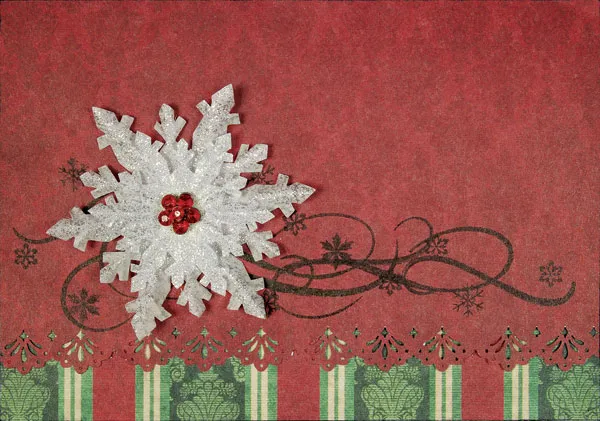 Add a 1/2” square of foam tape to the back of a small snowflower. Stack it on top of a large snowflower and then secure the stack with a small red rhinestone flower brad. Glue the stack to the front near the left end of the swirls.