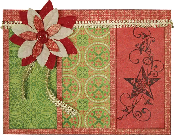 Punch a star flower from the red/gold small squares paper and ink the edges. Stack an ivory 2” silk poinsettia on top of a 2 1/2” burgundy poinsettia. Place the punched flower on top and secure the stack with a 1/2” red button brad.