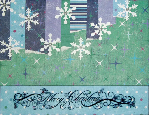 When you like it, start gluing them in place, again moving left to right, and overlapping the side edges slightly. Turn the piece over and score across the strips at the edge of the stars piece. Fold the ends to the back and glue in place. Glue the constructed front to the blank card front.