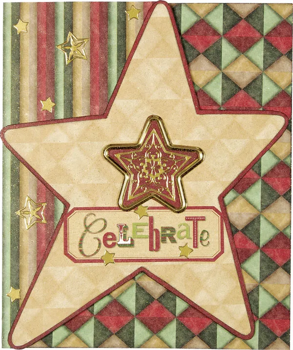 Trace the star pattern and cut it from the gold triangles paper. Ink the edges, then mat it on the matching burgundy paper. Ink the edges again. Cut out “Celebrate” and glue it to the star at the lower front.