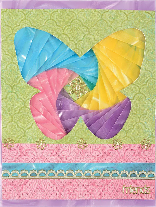 Cover a 6”x4 7/8” white cardstock with Botanical Etchings green paper. Trace the outline of the butterfly ½” from the top centered. Use the X-acto knife to cut the butterfly out. Save for later. Place the covered cardstock facedown over the Iris Folding diagram.