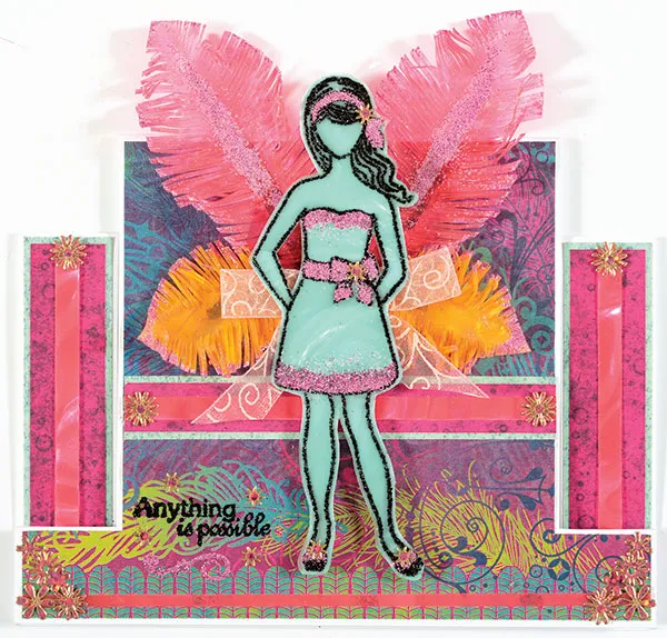 Card front: Use the patterns provided with your die-cut card to trace and cut out the front panel from Feathers feather border paper, keeping the border on the bottom edge. Glue the piece centered on the front panel of your card with a 1/16” border around the edges. Trace and cut out the side panels from Feathers teal scuff paper and glue centered on the side panels. Use VersaMark™ to stamp and emboss “Anything is possible” in black Zing! at the lower left. Stamp and emboss a Pink Fizz WOW! scroll below it.