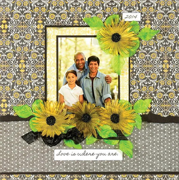 Using permanent ink, stamp the Fresh Cut large flower stamp 4 times on Yellow Moire Holographic Plastic Sheet. Cut out the flowers and heat edges with heat gun, curling them slightly. Fill the center of each blossom with dots of black glitter glue and let dry. Stamp 8 leaf sprigs onto Lime Moire Holographic Plastic Sheet. Cut out leaves and heat ends to curve slightly. Place 2 layers of foam tape behind the glittered center of each blossom. Place 1 at the top right photo corner and 3 along the border as shown.