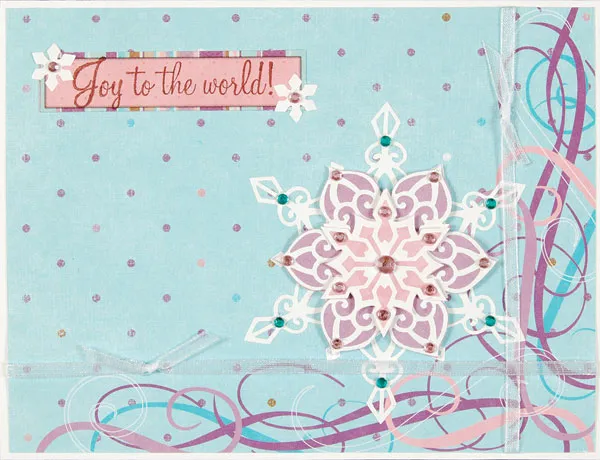 Punch out the 2 3/4” blank pink label and stamp “Joy to the world!” on it. Glue the label to the card front at the upper left, then add two small snowflakes with pink crystal centers as shown.