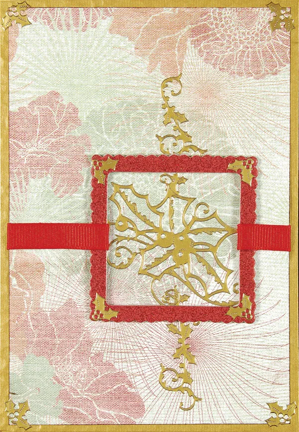 Glue the constructed front centered on the gold card front. Add triple leaf holly sprigs to each corner of the flowered paper. Add double leaf holly sprigs to each frame corner.