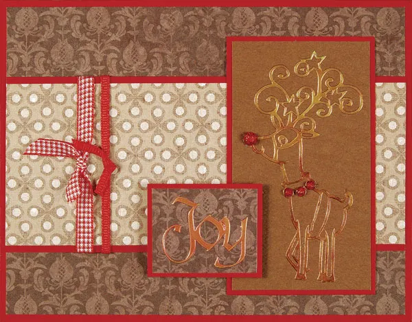 Using a foam applicator, repeat the inking process with red on the “Joy” sticker. When it’s dry after the second application, adhere the joy to the brown damask paper. Cut it to 1 1/2” x 1 1/4” and mat it on red. Add foam tape to the back and adhere it to the card as shown.