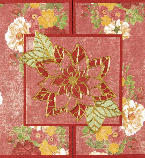 Add foam tape to the backs of the two smaller flowers. Stack and adhere them together, then glue the stack to the center of the red square. Tuck a leaf sprig under the flower edges at the upper left and one at the lower right. Glue the square to the left flap, adhering just the left half in place and allowing the right half to overlap the right front.