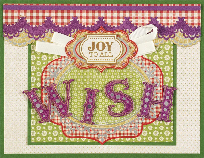 Punch out the Sugar Plum red/green label, “wish,” and 2¼" tan label die cuts and remove the nibs. Glue the large label to the green paper, overlapping the lower edge. Foam tape “wish” across the label as shown. Cut two 5½" ribbons and form each into a 1¼" and a 1½" loop. Secure the loops with tape then tape a set of loops extending from each end of the small label. Foam tape the label as shown. Cut out the Sugar Plum “joy to all” sentiment and foam tape to the small label.