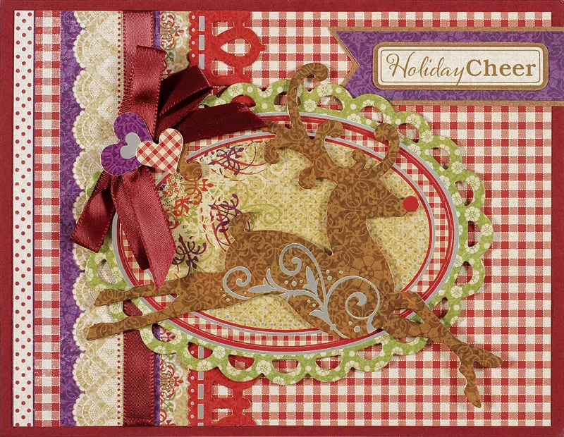 Punch out the Sugar Plum green lacy frame die cut, leaving the oval center intact. Punch out the reindeer, checked heart, and purple heart die cuts and remove the nibs from all the die cuts. Foam tape the oval/frame in the center, then foam tape the reindeer on it as shown. Make a bow with four loops and tie the center with thread. Glue as shown, then glue both hearts to the center.