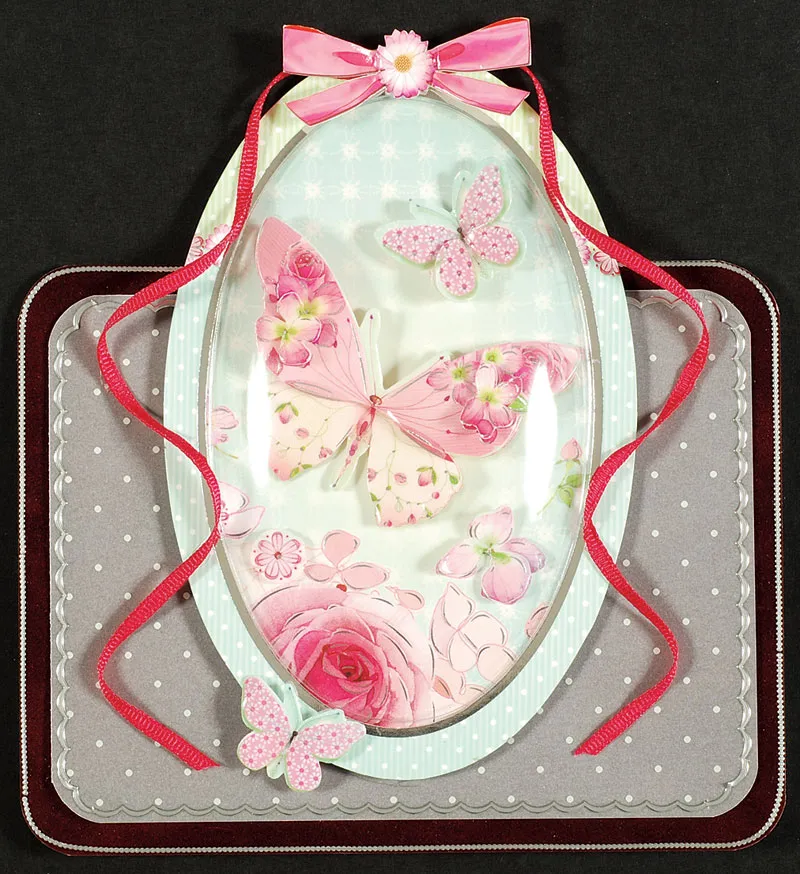 Pop out the coordinating foiled oval aperture panel. Pop out the oval center and set the aperture panel aside. Cut the large and small butterflies out of the panel and apply crystal lacquer as in step-4. Pop out the coordinating oval folding card die-cut, and cut along the joining fold line, saving one panel for later. Cut the pink bow out of the other panel, apply crystal lacquer and let dry.