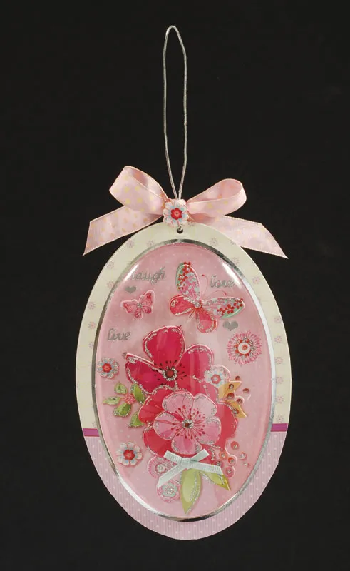 From the “Butterfly Bouquet” die-cut sheet, pop out the oval butterfly panel, the butterfly and the flower stacking die-cuts. Remove any paper nibs with your fingernail. Apply Silver and Pink Stickles to the panel and the elements. Let dry. Foam tape the flower die-cuts over the same images on the panel. Place Dazzles™ as shown. Zot™ on a bow, as shown.
