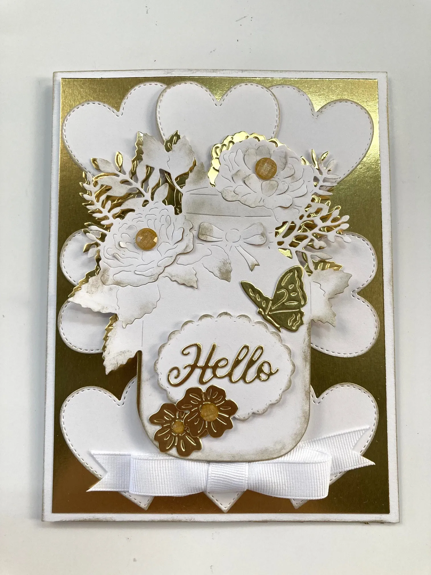 Die cut two flowers, a butterfly, and the "Hello" out of gold cardstock. Die cut the oval label out of white cardstock. Use a blending brush to put gold ink on the label's edges and foam tape it to the jar as shown. Glue the gold pieces as shown. Place Diamond Sparkles in the flower centers. Make and Zot™️ a 2 1/2" white bow below the jar.