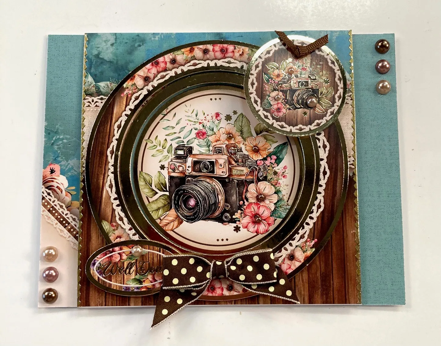 With the fold on the top of a blank card, trim 3/4" off each side of card front to the fold. Select the "Teal Treasures" printed sheet and cover the card front placing the teal bordered Adorable Scorable from the collection on top flush to top and one side; trim off the excess. Tape the third largest circle die in the center, open card, and run through the die cutting machine. Glue the middle gold Topper layer around the die-cut circle. Foam tape the outer circle Topper around that. Foam tape the small Toppers on outer frame as shown. Make and Zot™️ 2" wide bow at the bottom of the outer frame then Zot™️ a brown ribbon knot to the small camera Topper. Place a pearl on both small Toppers.