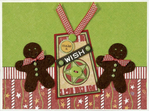 Cut two 1 1/2” lengths of ribbon and tie a knot in the center of each. Trim the ends to make each 1” long, then glue one to the chin area of each gingerbread man. Adhere 3mm glitter domes as buttons on the fronts of the men, then glue the men to the card front as shown.