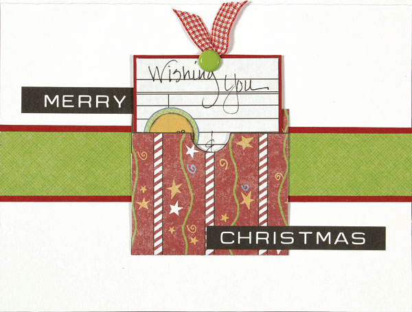 Cut out the white card, “peace,” and “love.” Write “Wishing you” at the top. Glue the two word pieces as shown, then write “&” and “this Christmas!” on the card as shown. Mat the card on red. Add a lime brad at the top and tie a 2” piece of ribbon around it. Trim the ends, then insert the card in the pocket.