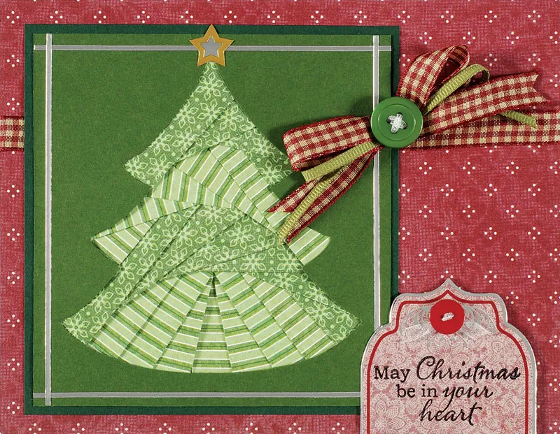 For the card front: Turn the card with the fold at the top. Cut Christmas Lace maroon dotted paper to cover the front. Glue 7½" maroon gingham ribbon across the paper, 1¼" from the top, and glue the ends to the back. Glue the paper to the card. Cut 4 1/8"x4¼" leaf green cardstock and follow the template directions to trace and cut the tree and to secure the cardstock to the template.