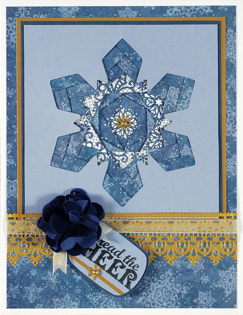When finished, remove the cardstock carefully and discard the stencil tape. Trim any excess strips and tape along the cardstock edges. Mat on dark blue cardstock with 1/16" borders, then on gold paper with 1/16" borders. Cut 4¾"x6¼" Christmas Lace blue snowflakes paper and glue the folded snowflake ¼" from the top. Place Dazzles™ wide lace border across the bottom of the snowflake, then glue ribbon across as shown, gluing the ends to the back. Glue the paper centered on the card front.