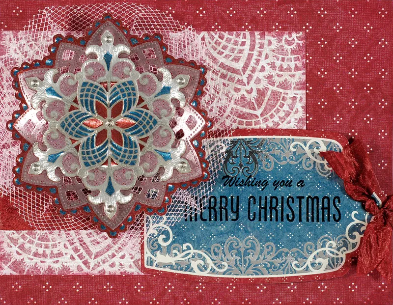 For the card front: Turn the card with the fold at the top. Cut Christmas Lace maroon dotted paper to cover the front and 5"x4" Christmas Lace pink doily paper. Ink all the edges maroon. Glue the pink paper to the maroon paper, centered along the left edge. Punch out the Christmas Lace blue tag and remove the nibs. Stamp “wishing you a merry Christmas” on it with black ink. Thread the tag onto a 6½" ribbon, then glue the tag and ribbon as shown, wrapping the ribbon ends to the back. Glue the paper to the card.