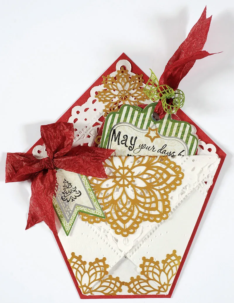 Glue the pocket to cardstock and cut out, leaving a 1/16" mat on all sides. Place a 3" Dazzles™ doily to the front flap, wrapping it to the inside. Cut sections off a 2" Dazzles™ doily and place in the lower front corners, then place a 1¼" doily on the upper back point. Punch out the Christmas Lace small green tag die cut and remove the nibs. Stamp a tree on it, then glue to the left front corner. Tie a maroon bow and glue to the tag top.