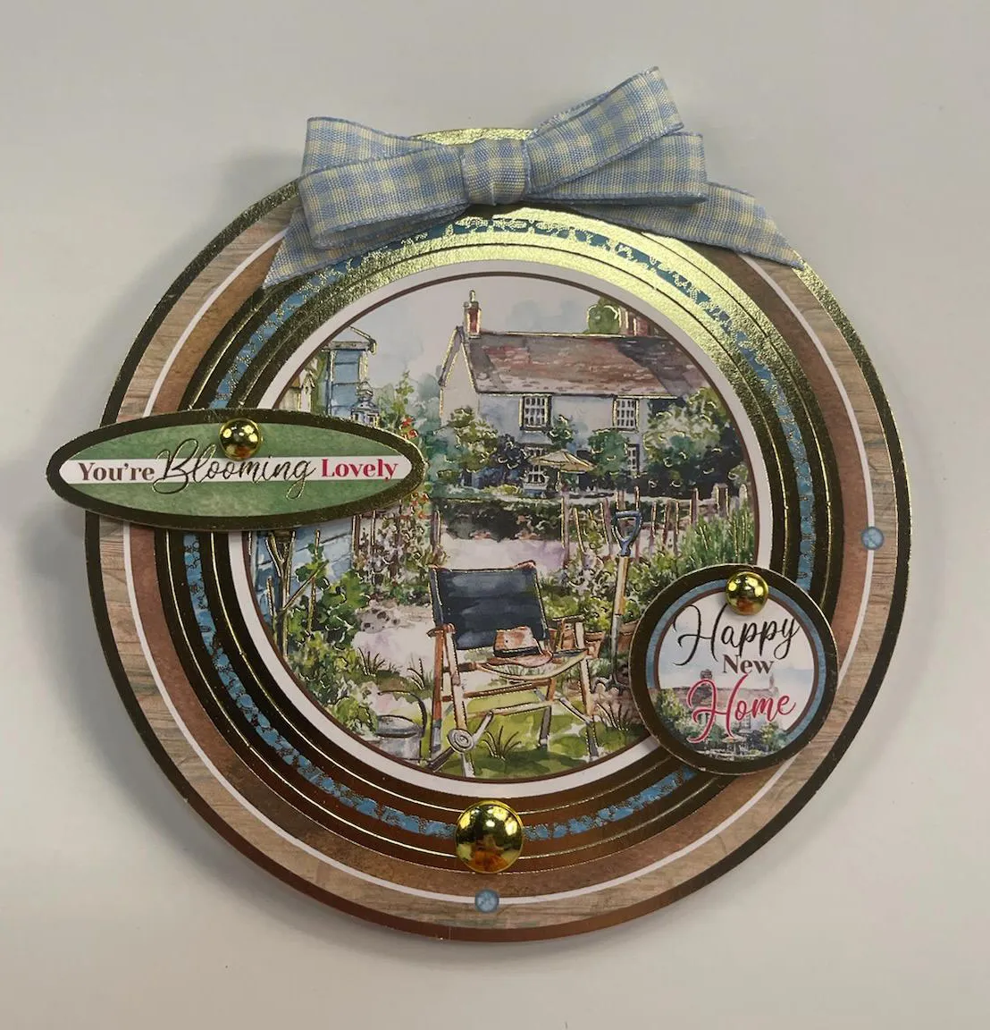 With a folded white card, place the largest straight edged circle die just slightly over the folded edge and run through die cutting machine. Fold the front in half with a mountain fold. Select the large circle Topper with the cottage from the "In the Garden" collection to be the focal. Die cut a large circle from the wood design on the Patterned Adorable Scorable and glue to the back of the topper with the wood side showing. This will stabilize the Topper as well. Glue to the bottom half of the folded card front. Foam tape the "Your Blooming Lovely" and "Happy New Home" sentiments as shown. Zot™ a 2" wide blue bow and place gold studs as shown.