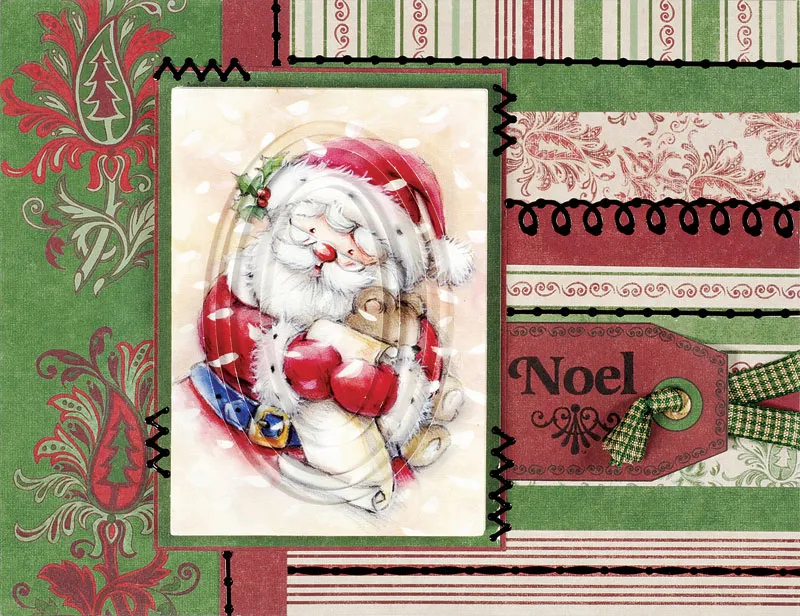 Cut out the Christmas burgundy tag. Stamp “Noel” near the fastener end with a swirl under it. Cut two 4" ribbon lengths and knot together near one end. Punch a hole in the tag and thread the two unknotted ends through to the back. Glue the tag to the front, 5/8" from the right edge. Glue the ribbon ends under the papers, then glue the paper in place. Punch out the Santa papier tole and stack as directed, placing foam tape between the layers (I left off the last 8 corner pieces). Glue to the front, then cut Dazzles™ and place on the card as shown.